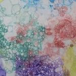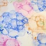 - Once a nice amount of bubbles is created in the bowl, gently roll your poster paper along the surface of the colored bubbles. The bubbles will create lovely painted bubbles on your paper before they pop.