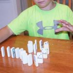 A favorite playtime activity in our house is creating a Domino Run. This activity is accomplished by lining dominoes up in a continuous line that is straight or curvy or spiral in shape. You stand them up on one end and line them up close enough together so that when one falls, they all will knock the one after it down. Use care when setting up a Domino Run as one wrong move or slip of the hand will spark a chain reaction of dominoes that will leave you starting over.