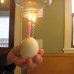 1. Stick three birthday candles into the end of the hard boiled egg and light the candles.
