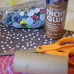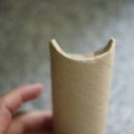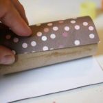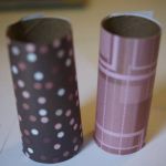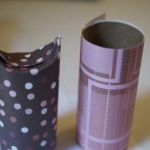 - Glue your scrap of paper on to the end of the tube, then glue strips of scrapbook paper around the tube.